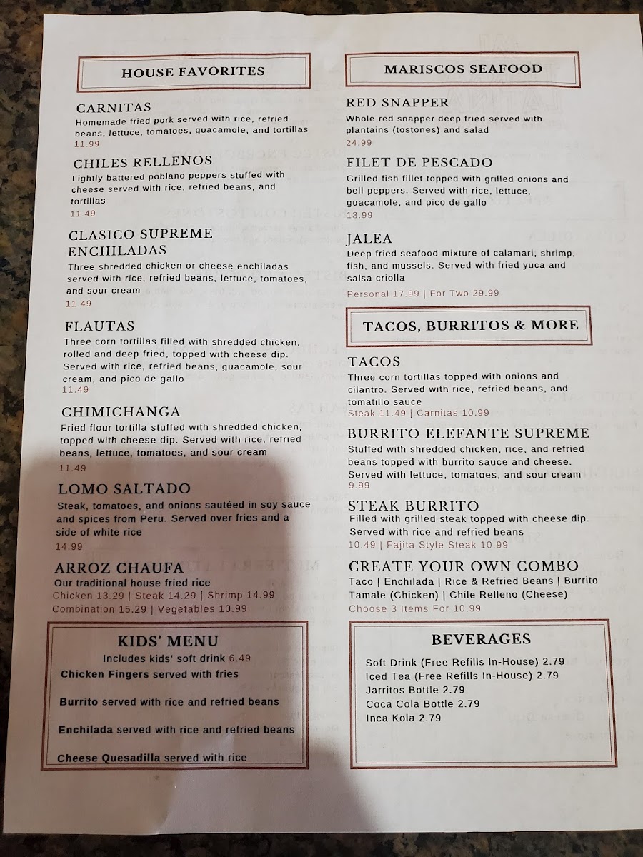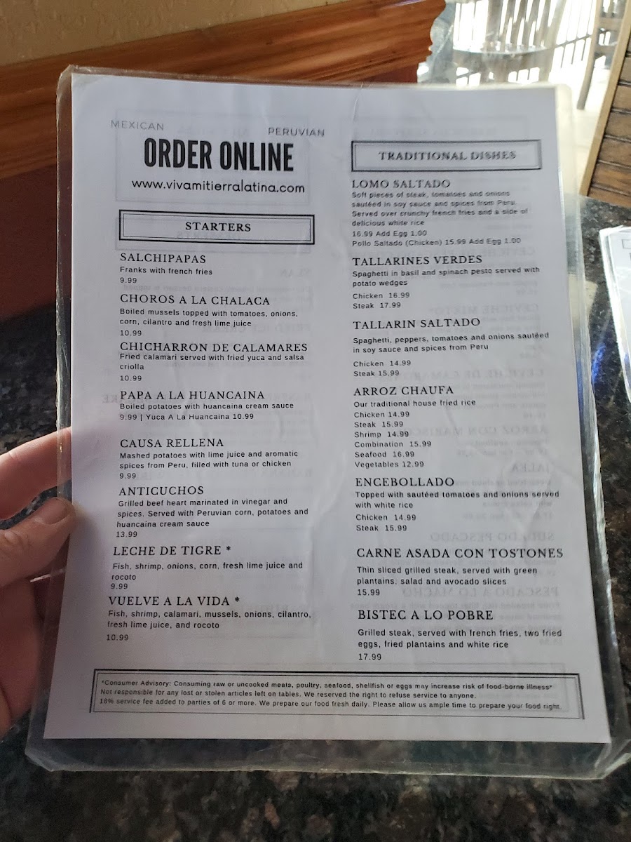 Mi Tierra Latina Mexican & Peruvian Menu