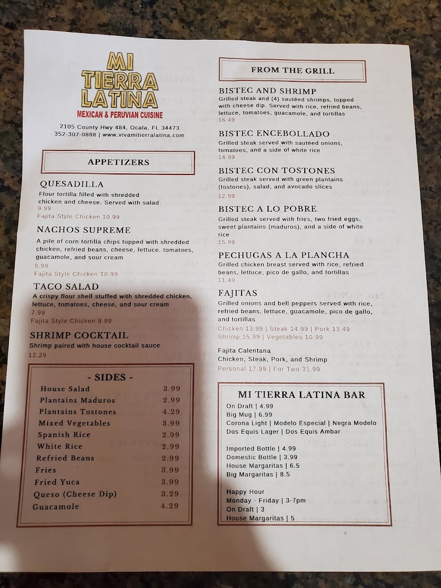Welcome to Mi Tierra Latina Mexican & Peruvian, a culinary gem nestled in Ocala, Florida. This vibrant restaurant beautifully marries the bold flavors of Mexican and Peruvian cuisine, offering an extensive menu that caters to diverse tastes.
